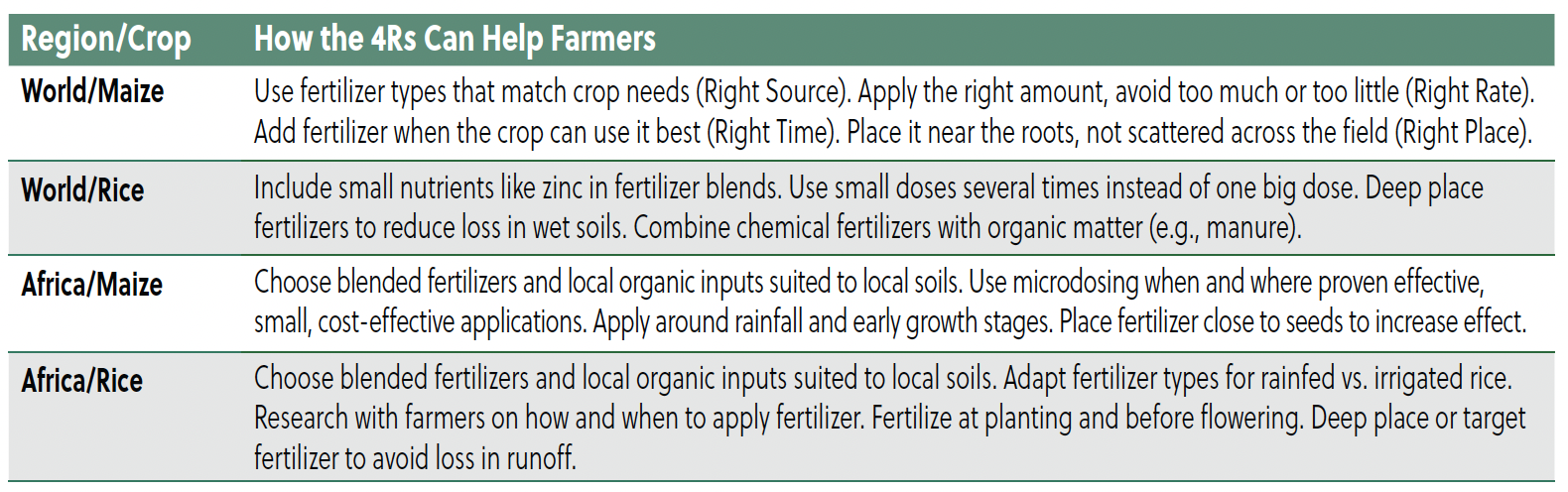 The Role of 4R Nutrient Stewardship: The 4R Nutrient Stewardship Framework, Right Source, Right Rate, Right Time, and Right Place, offers a proven, flexible approach to managing fertilizer use efficiently and sustainably. The Table below outlines how the 4Rs can help improve productivity and sustainability for maize and rice in both global and African contexts: