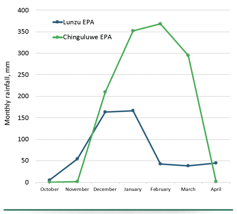 Monthly rainfall at Chinguluwe and Lunzu EPAs