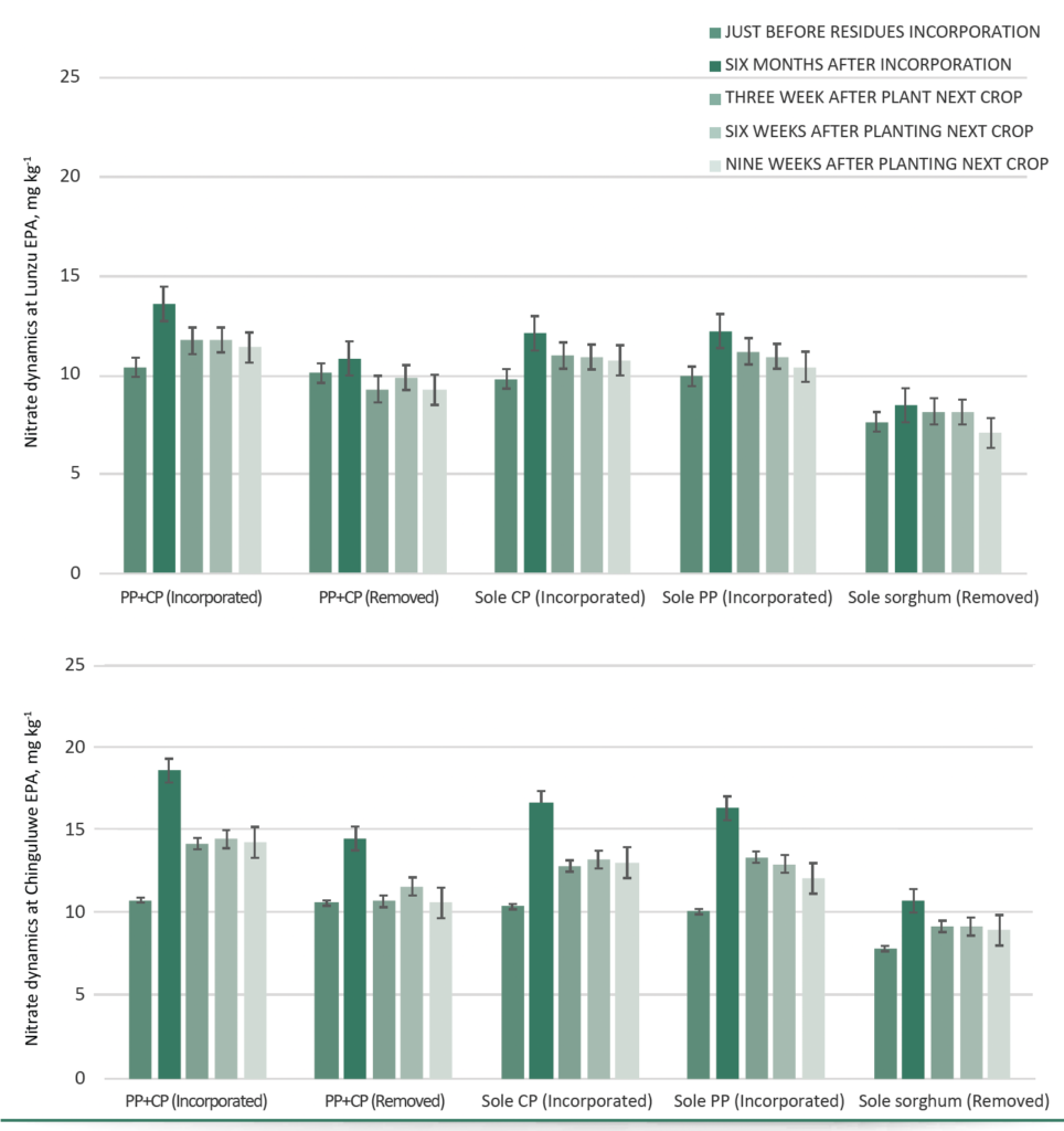 Over time, nitrate peaked six months after residue incorporation (Chinguluwe: 18.65 mg/kg; Lunzu: 13.60 mg/kg) and declined gradually during subsequent crop growth (Fig. 3). Residue-incorporated systems maintained nitrate above pre-incorporation levels, whereas systems with residue removal exhibited persistently lower nitrate, emphasizing the role of incorporating high N organic matter sources in sustaining soil N availability.