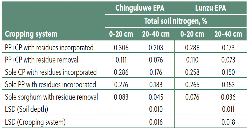 Table 6. Effects of cropping system total soil nitrogen (%) at Chinguluwe EPA and Lunza EPA.