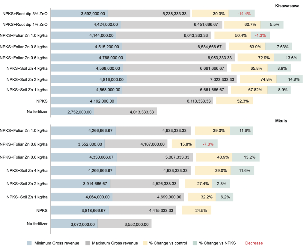 Zinc fertilization strategies significantly affected grain yield at both experimental sites (Table 5). Application of all fertilizers significantly increased yield and gross income by 2-75% over the no fertilizer treatments, while addition of soil and foliar Zn at all rates increased grain yield and gross income by 15% relative to the NPKS (Fig. 2). Exceptions included the slight decrease in yield in T8 and T10 at Kisawasawa and T7 at Mkula.