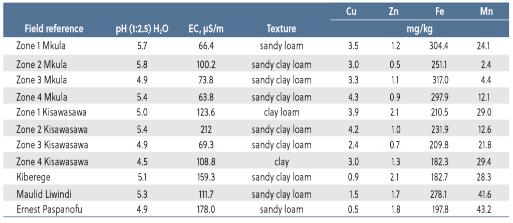 In Kisawasawa, the pH ranged from 4.5-5.4, indicating acidic conditions. The soil textures were predominantly clay and sandy clay loam. Zinc concentrations ranged from 0.7-2.1 mg/kg, with most zones having Zn concentrations above the critical deficiency threshold, though Zone 3 exhibited marginal Zn status at 0.7 mg/kg. Copper concentrations in Kisawasawa were consistently above the critical deficiency level, ranging from 2.4-4.2 mg/ kg. Iron concentrations were similarly high, ranging from 182-231 mg/kg, and Mn concentrations were sufficient across the site, with values ranging from 12.6-43.2 mg/kg.