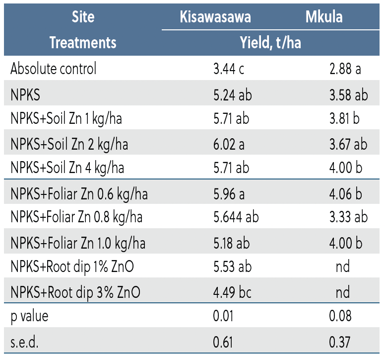 The Kisawasawa site had consistently higher yields across all treatments, with the highest yield of 6.02 t/ha obtained in T4 (soil applied NPKS and soil incorporation of NPKS plus ZnSO4 prior transplanting at 2 kg Zn/ha). The highest yields in Mkula were obtained in T6 (NPKS + foliar applied ZnSO4 at rates of 0.6 kg Zn/ha) (4.06 t/ha), T5 (NPKS + soil applied 4 kg Zn/ha) and T8 (NPKS seedlings dipping in 1% ZnO), both of which recorded 4 t/ha. These results show site-specific responses of rice to Zn fertilization. Furthermore, root dipping rice seedlings in 3% suspensions of ZnO decreased rice yield in Kisawasawa.