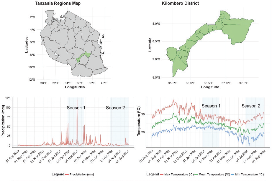 The field experiments were conducted in the Kisawasawa rain-fed scheme, and the Mkula irrigation scheme (Fig. 1). These two represent some of the most prominent rice growing areas in Kilombero district, making it one of the three districts contributing to Morogoro’s leading contribution to rice production in Tanzania, with 22% of land under rice production and 17% of rice production in Tanzania (TZA-NBS-AASS, 2023). The Kilombero district falls within a tropical savanna climate. The area has two distinct rainy seasons: a short season from October to December and a longer season from March to May, interspersed with dry spells, with the mean annual rainfall of between 1200-1400 mm. The average temperature ranges from 22-23°C.